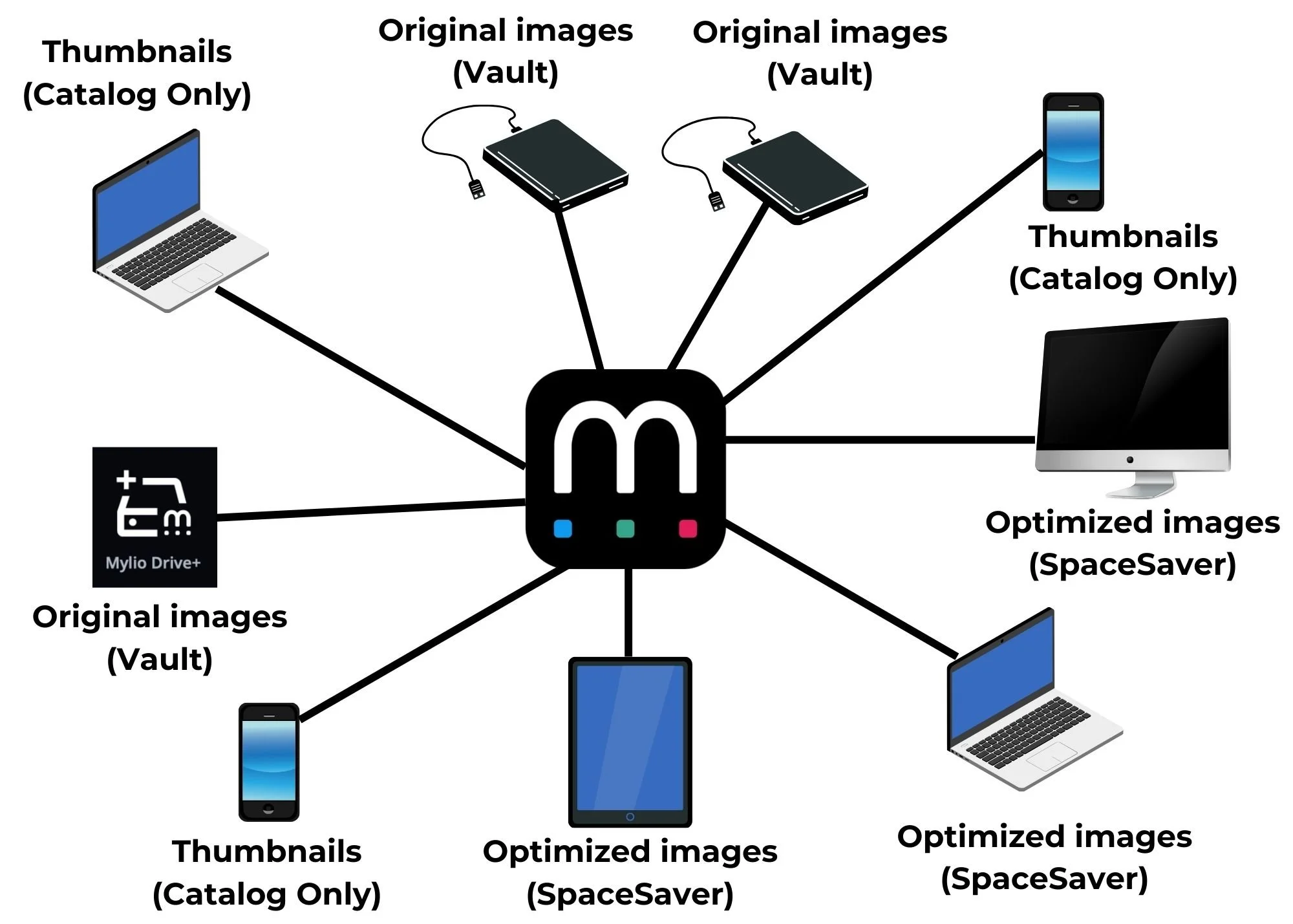The way that Mylio works is that it will store a version of your images on every device that is connected to your Mylio account. Every device, this means phones, hard drives, tablets, computers, etc.