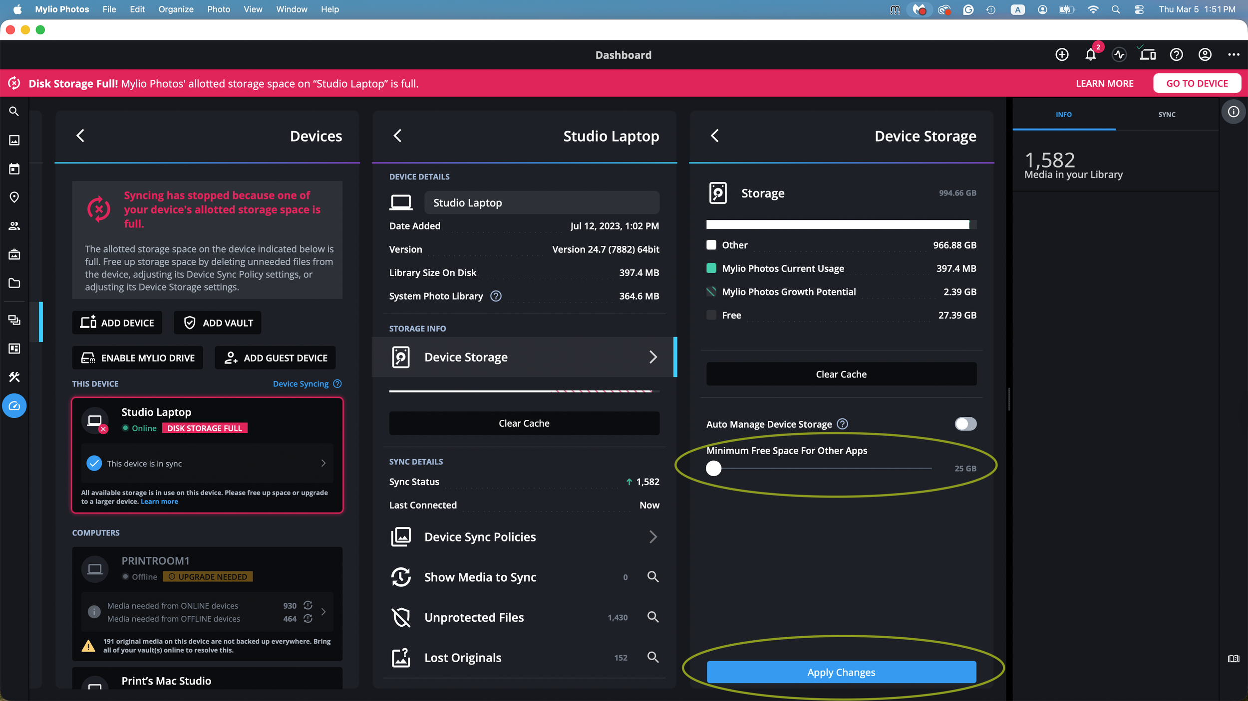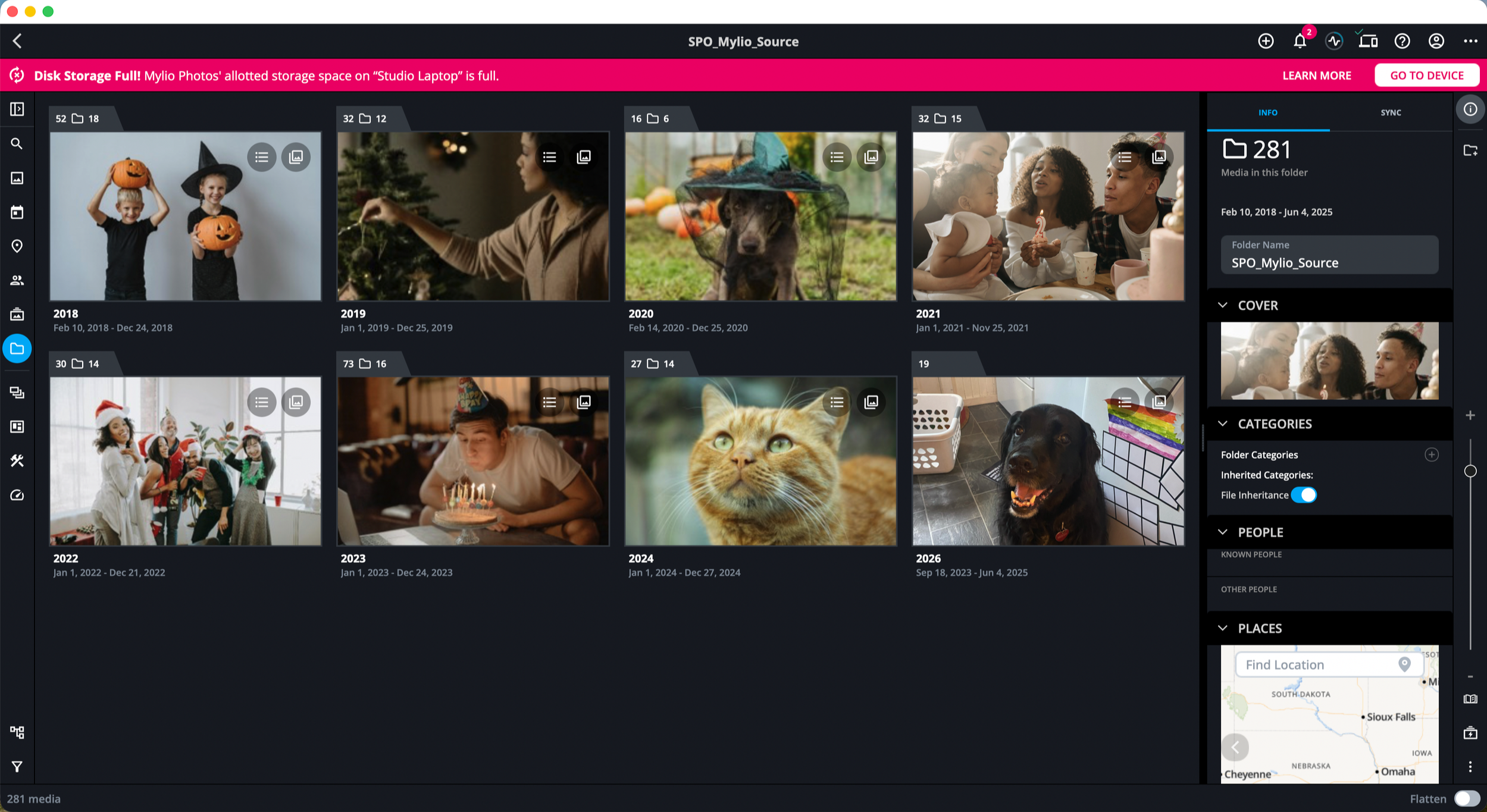 If you see a notification bar across the top of your Mylio photo library that says the Disk Storage is Full, there are a few things you can do to fix it.