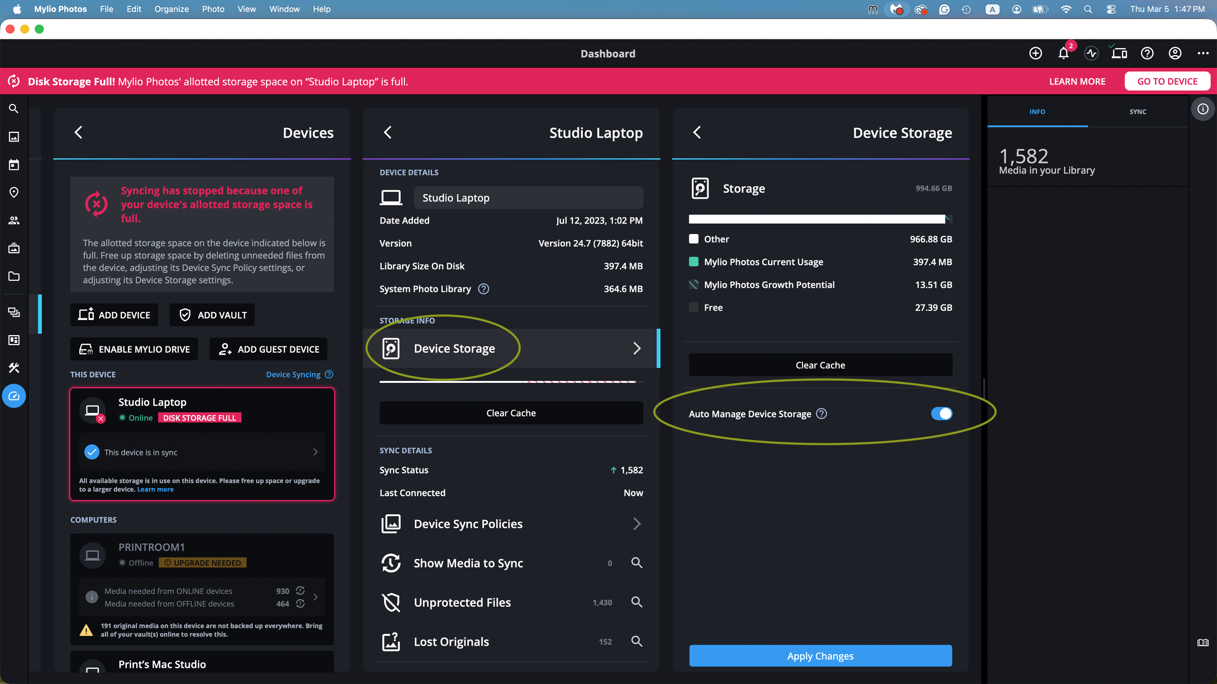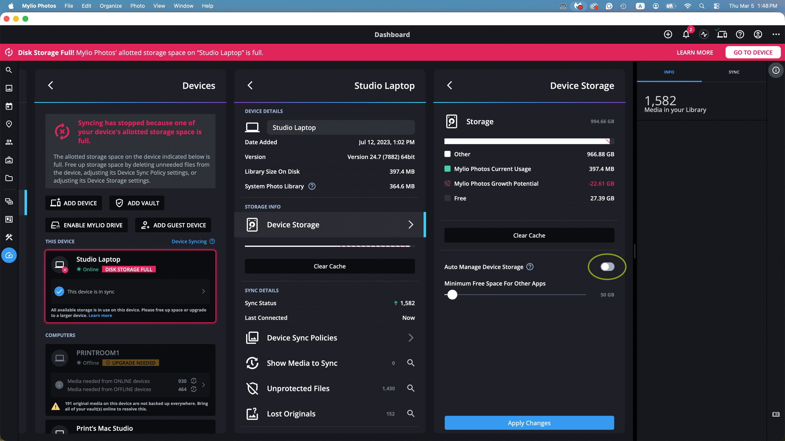 Mylio allows you to control how much storage space is available on each of your devices at any given time. If, for example, this is set to 20GB, and Mylio sees that your device only has 20GB of storage left on it, Mylio will stop syncing, and you will get the notification above.